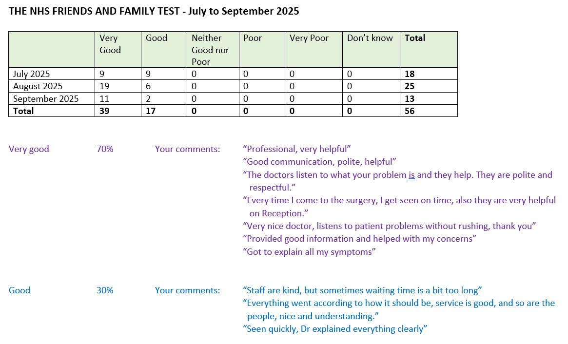 From 1st December 2014 it is a contractual requirement that all GP practices undertake the NHS Friends and Family test (FFT). The first two questions have been set by NHS England. The purpose of the question is to give patients the opportunity to provide feedback on their experience that can be used to improve services. Periodically we will send the results to NHS England.The test should take no more than a couple of minutes and we would be very grateful for your response.